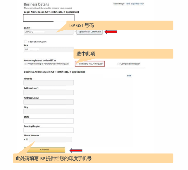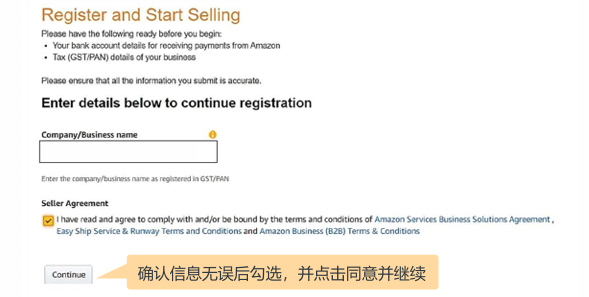 根据您在公司注册证书/营业执照中的公司名称输入注册公司名称或是输入 ISP GST 证书上的名称并同意阅读协议后的条款和条件。点击“continue”注意:此处的法定名称应与您的公司名称或是 ISP 的 GST 证书中的名称完全一致。卖家必须勾选复选框并接受 条款才能进行下一步。