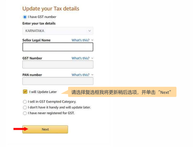 更新如下所示的税务细节。请选择复选框我将更新稍后选项,并单击“Next”