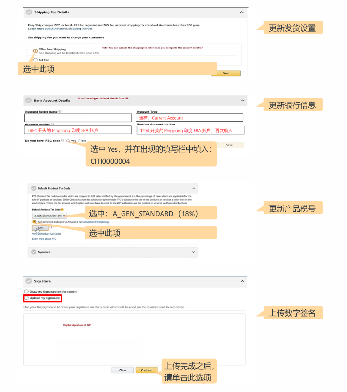 更新如下所示的发货设置、银行信息、产品税号、数字签名。