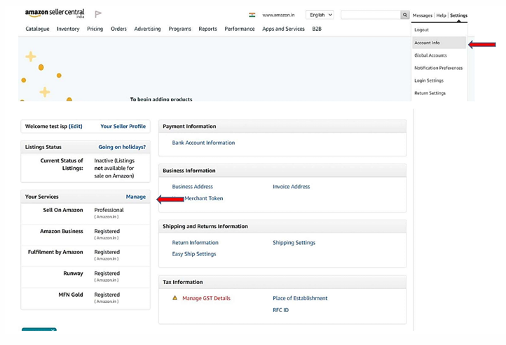 如果你在更新以上细节时得到任何重复的 GST 错误,单击“continue”在页面底部的卖方中心进入设置Settings>帐户信息 Account Info>管理 Manage。