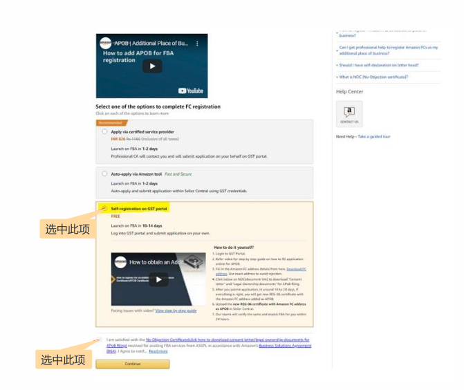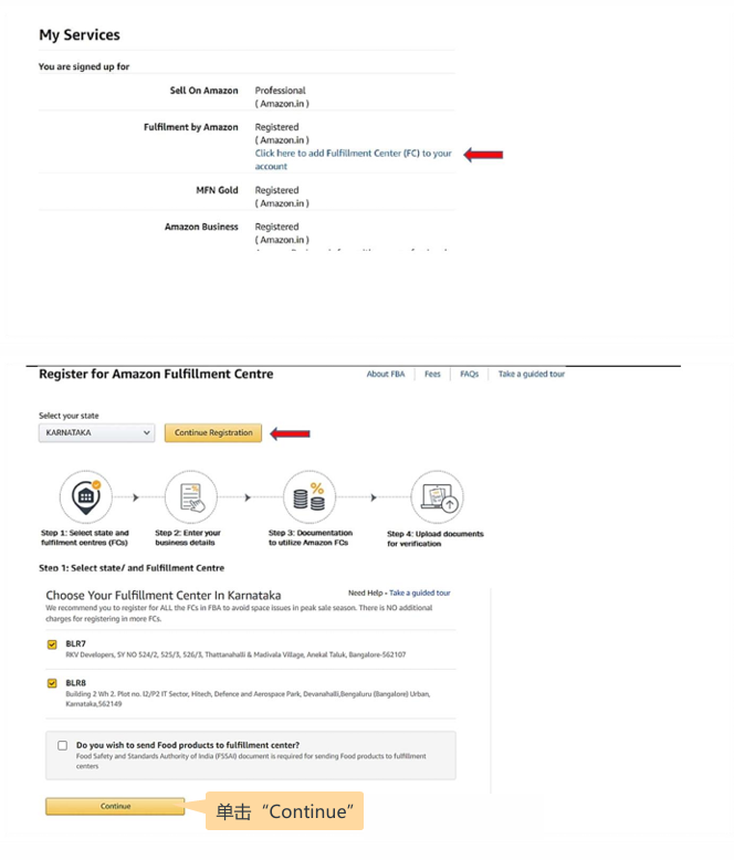 点击-“click here to add Fulfillment center(Fc)to you 点击这里添加物流中心 (FC) 到您的账户”,选择GST 证书中记录的州,然后点击“continue Registration”。现在选择 Fulfilment center,点击“continue”。