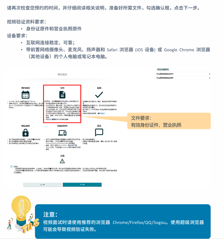 1)请在注册前准备好以上材料,否则会卡在某一步骤导致注册中断,如出现这种情况,您可以离开一段时间然后回来用正确的注册邮箱和设置好的密码登陆继续注册。如果遇到无法登陆的情况请确定网络环境稳定,可以尝试清除浏览器Cookie,更换浏览器,建议使用推荐浏览器(Chrome/Safari)。