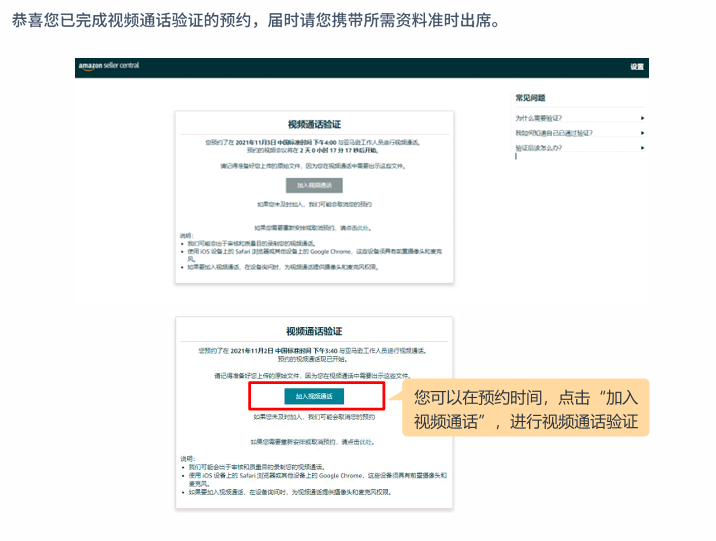 您的账户在被停用之后,可能会同时遇到视频验证。如果进入卖家平台收到来自如下的业绩通知则说明您遇到了视频验证。请您在提交审核申诉资料的同时,于收到邮件7天内点击邮件内链接预约视频面试,否则您将没有资格在亚马逊商城销售商品。