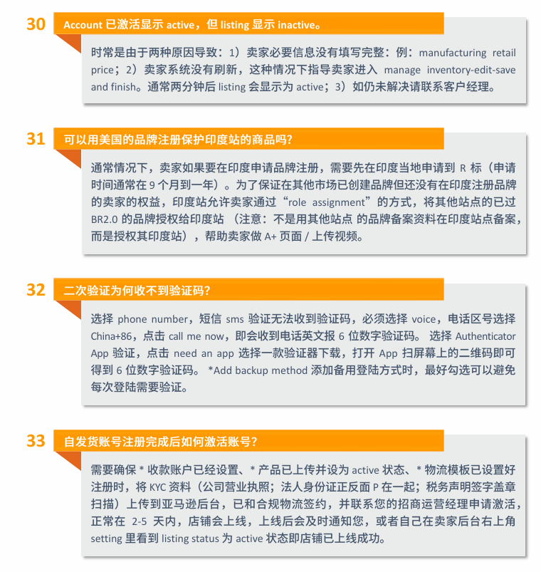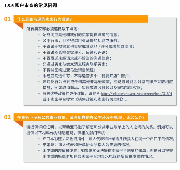 从账户注册开始,所有卖家在亚马逊商城都必须遵守销售政策和卖家行为准则。亚马逊要求卖家在亚马逊商城遵循公平、诚实的行事原则,以确保安全的购买和销售体验。若违反行为准则或任何其他亚马逊政策,亚马逊可能会对您的账户采取相应措施,例如取消商品暂停或没收付款以及撤销销售权限。