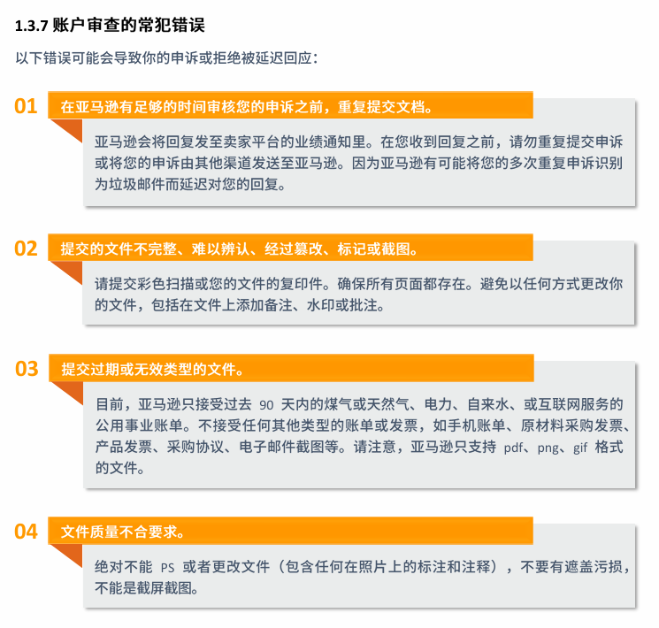 3)如果亚马逊确定您的帐户被用于欺骗性、欺诈性或者非法活动(例如,使用购买的帐户进行销售),亚马逊可能会暂停或终止您的账户和销售权限。